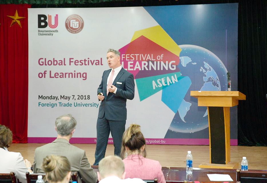 He applauded the initiative to organize the Global Festival of Learning 2018 of Bournemouth University in Asean and celebrated the event with a variety of activities which were taking place at FTU on May 7th, 2018 to promote cooperation between two universities, enhance engagement with businesses to be more creative and better adapt to new trends in Talent Management in particular and human resources management on a global scale in general.