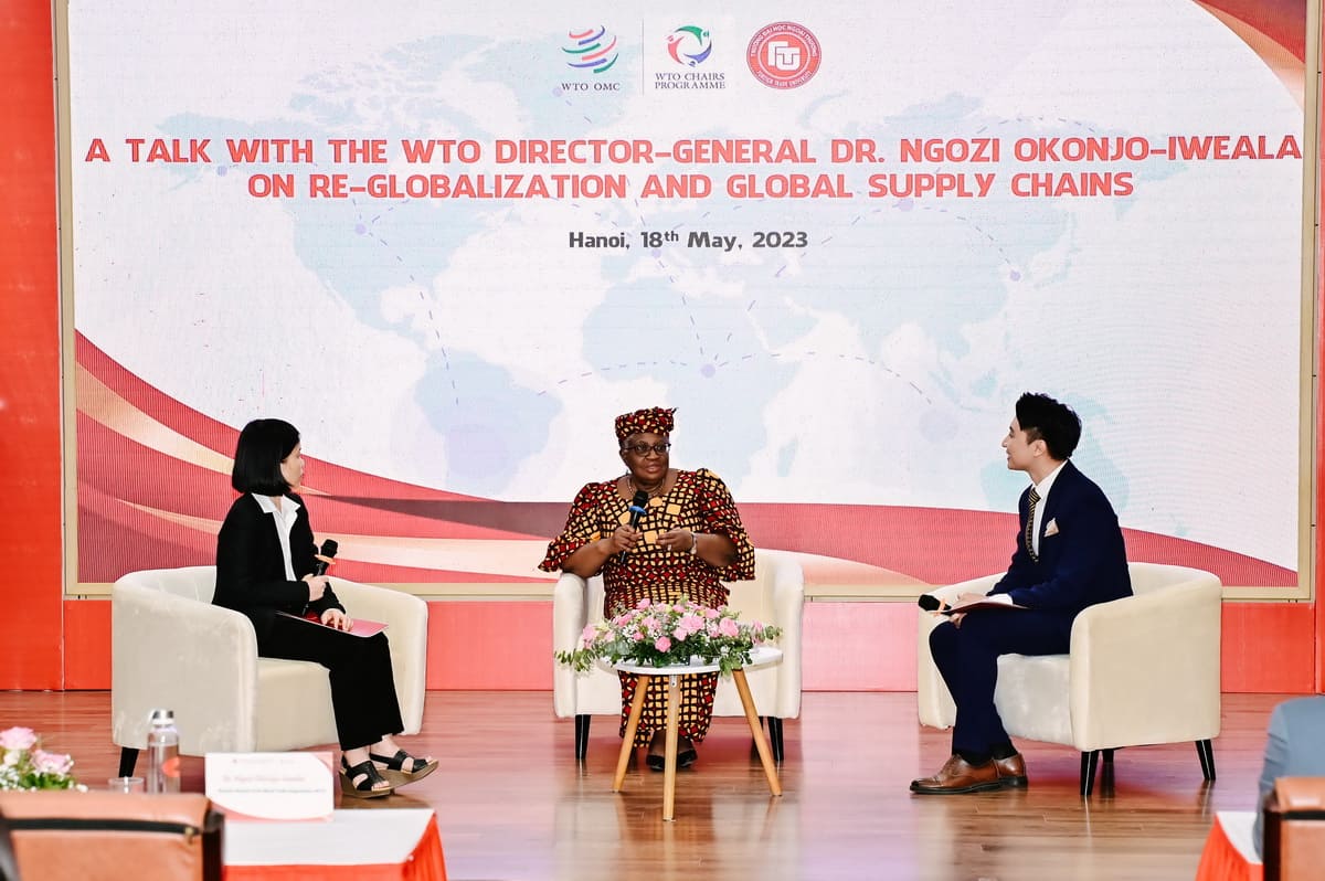 Within the program’s framework, a discussion took place with the intriguing theme of “Re-globalization and Global Supply Chains.” The conversation featured insights from Dr. Ngozi Okonjo-Iweala, the WTO Director-General, and Assoc.Prof.Dr. Trinh Thi Thu Huong, Vice Dean of the Schoolof Economics and International Business who also serves as the Director of the WTO Chair Program at Foreign Trade University. The topic of the discussion holds particular relevance in a world transitioning from globalization to re-globalization, as it grapples with challenges like inequality, climate change, and health crises. During this transition, companies are increasingly decentralizing production to safeguard against supply chain disruptions.