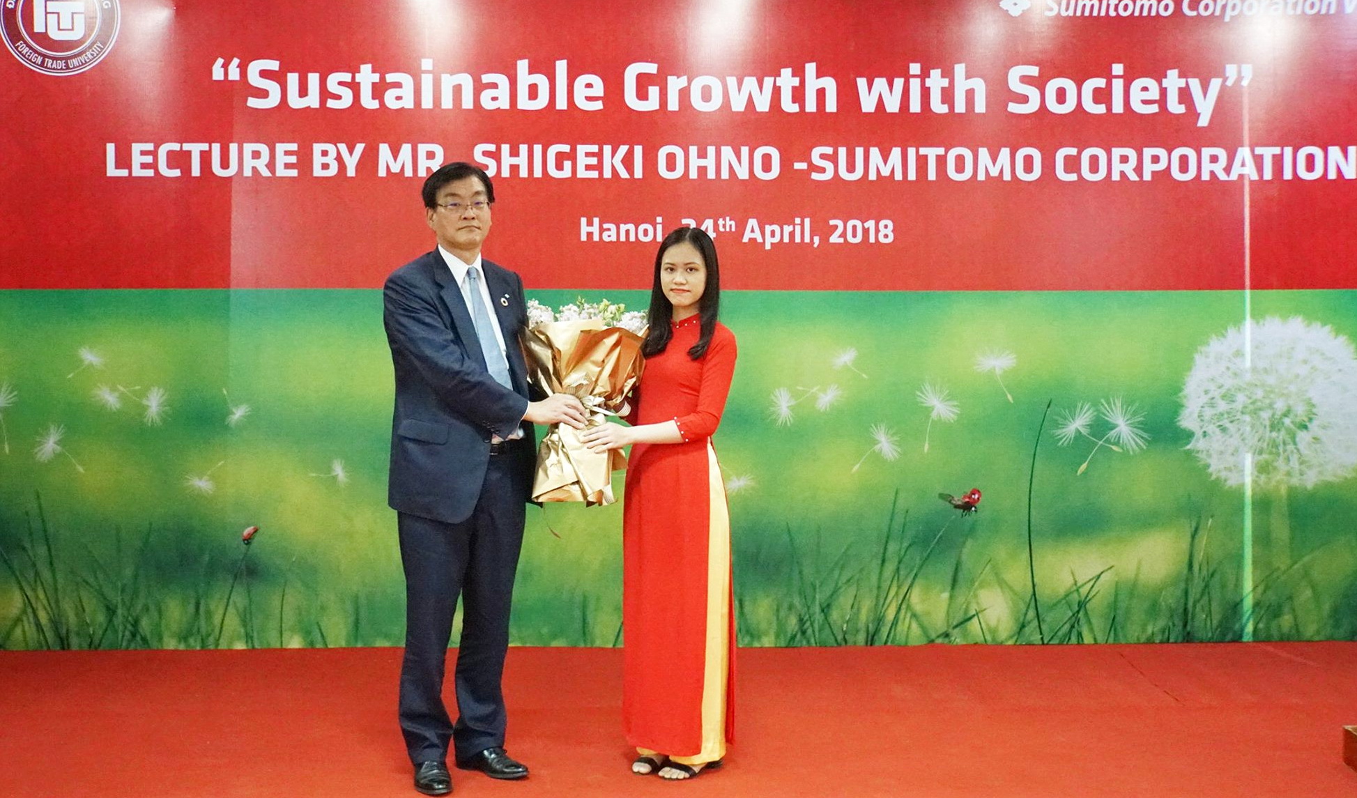 On behalf of FTU, Assoc. Prof. Dr. Nguyen Thu Thuy – Vice President sent the warmest greetings to the delegation from Sumitomo Corporation and warmly welcomed the delegation to continue on the annual lecture for students of FTU. She assumed that today’s lecture not only provided insights on the trend of sustainable development and how humans could contribute to the humanity, but also provided a platform for the participants to share and contribute ideas to promote sustainable development, social welfare system and build policies for the green economy. She also expressed her sincere thanks to Sumitomo Corporation for its commitment for social responsibility. Finally, she wished the Sumitomo Group a more successful business in Vietnam and the cooperation between Sumitomo Group and FTU became more and more effective and in the long term.