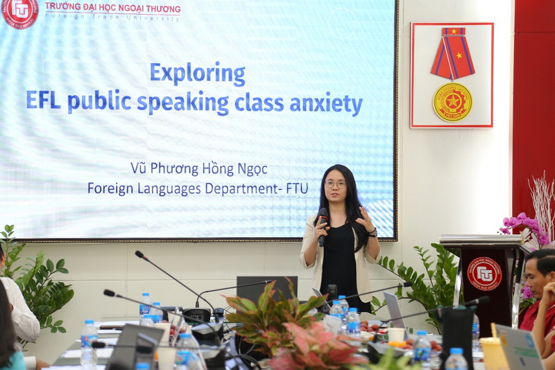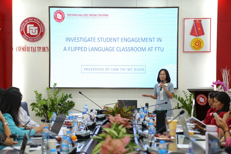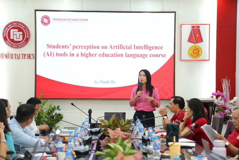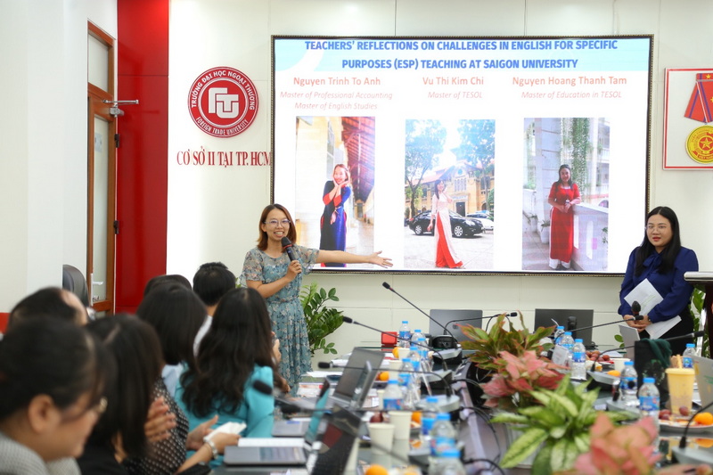 The main content of the seminar revolved around 6 presentations, presented in English and Vietnamese with topics such as: “Students’ awareness of artificial intelligence (AI) tools in a language course in higher education” by Ms. Le Thanh Ha; “Understanding anxiety in public speaking” by Ms. Vu Phuong Hong Ngoc; “Lecturers’ reflections on challenges in teaching specialized English at Saigon University” by a group of authors from Saigon University; “Research on university students’ attitudes towards online tests: the case at FTU” by Ms. Lam Thi My Dung and “Improving understanding of economic, legal and idiom terminology in specialized reading materials” by Ms. Tran Nam Thien Huong. At the end of the seminar, Ms. Nguyen Thi Nhu Thuy – Senior Product Manager – Dai Truong Phat Education Group presented on the use of materials in teaching specialized English (ESP).