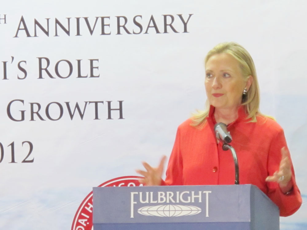 The United States Secretary of State Hillary Clinton was giving a speech at Foreign Trade University