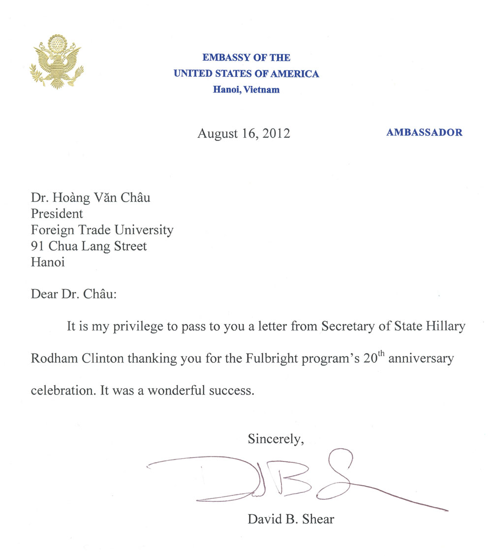 Prof. Dr. Hoang Van Chau, President of Foreign Trade University with faculty members and more than 200 FTU students and more than 100 former students of the Fulbright scholarship program have expressed honor and pride to welcome Mrs Hillary Clinton and the corps diplomatic of USA.