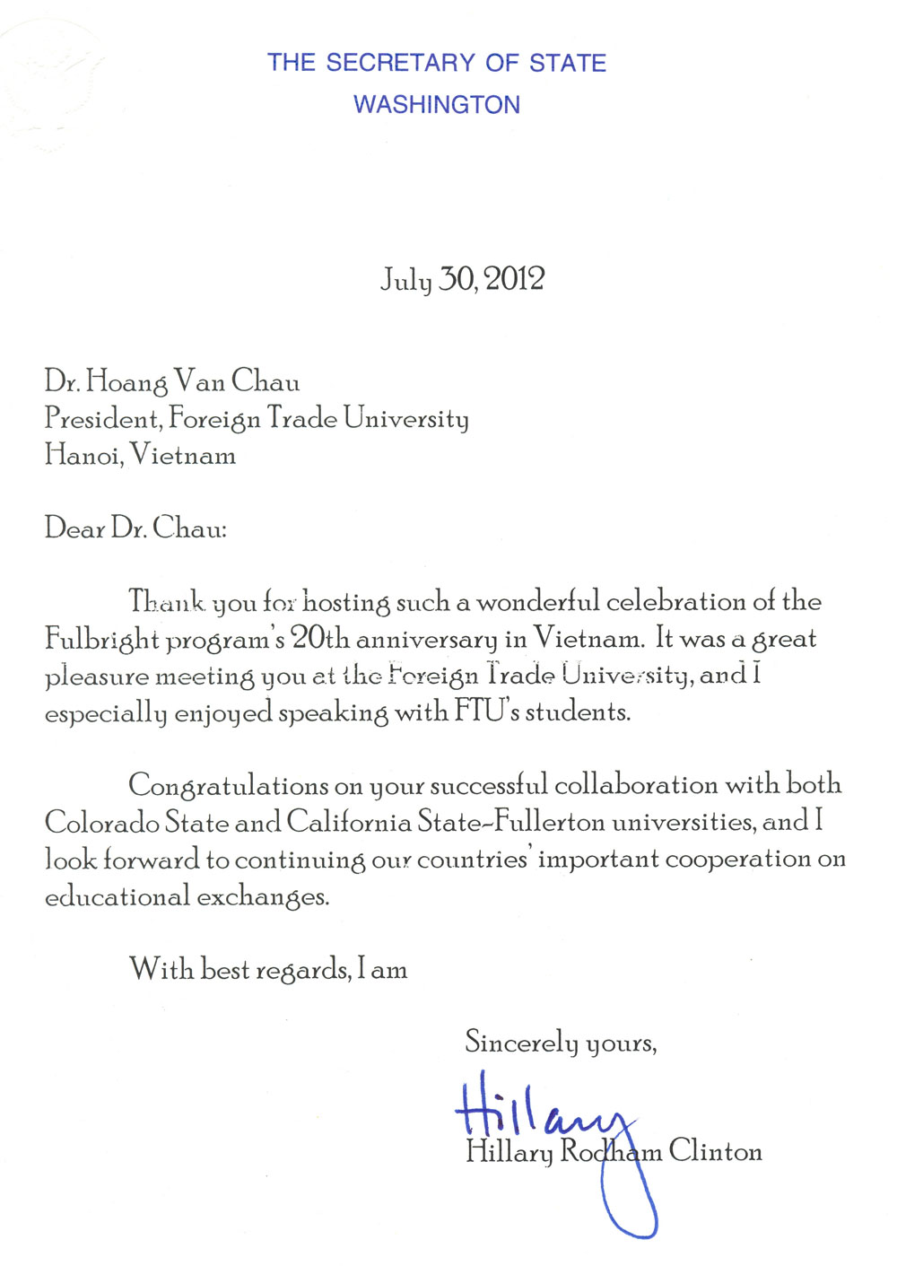Education is one of the priorities of the Secretary of State Mrs. Hillary Clinton in relations with Vietnam, Foreign Trade University currently has very good cooperation with the major universities of the United States such as Colorado State University, California State University – Fullerton, University of Hawaii … and in the future, FTU will further expand the cooperation with many universities in the United States to be able to bring Vietnam students new opportunities to learning and research. Prof. Dr. Hoang Van Chau expressed his desire to welcome Mrs. Secretary next time.