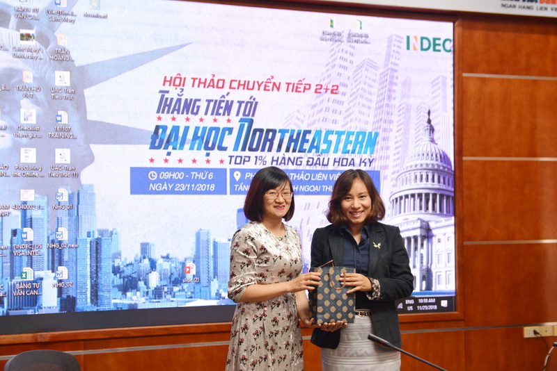 Dr. Nguyen Thuy Anh – Vice Dean of Business Administration (left) presented gift for Ms. Oanh Nguyen – Northeastern University Admissions Representative and KAPLAN International Pathways in Southeast Asia (right)