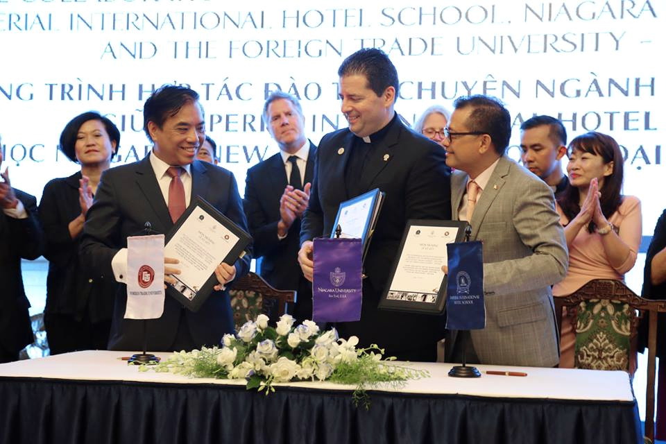 The Foreign Trade University is one of the leading university in Vietnam, with 57 years of experiences in providing high quality human resources in Vietnam’s international integration process. The Imperial Intenational Hotel School which belongs to the Imperial Group with its practical experience in the field of luxury travel hotels. The Niagara University, whose College of Hospitality and Tourism Management was the first school of tourism in the United States and the seventh to receive ACPH accreditation. It is a founding member of Hotel Schools of Distinction. The three sides would coordinate the implementation of training courses under the agreement.