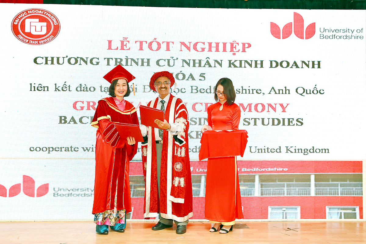 At the same time, Univesity of Bedfordshire committed to give the allowance for students to access to their library from the first year. Besides, Foreign Trade University also hold the graduation ceremony for students class 5 of the associated program between Foreign Trade University and University of Bedfordshire. The ceremory of 21 students finishing their last year in Vietnam had a great meaning, marking the success of the full time associated education in Vietnam.