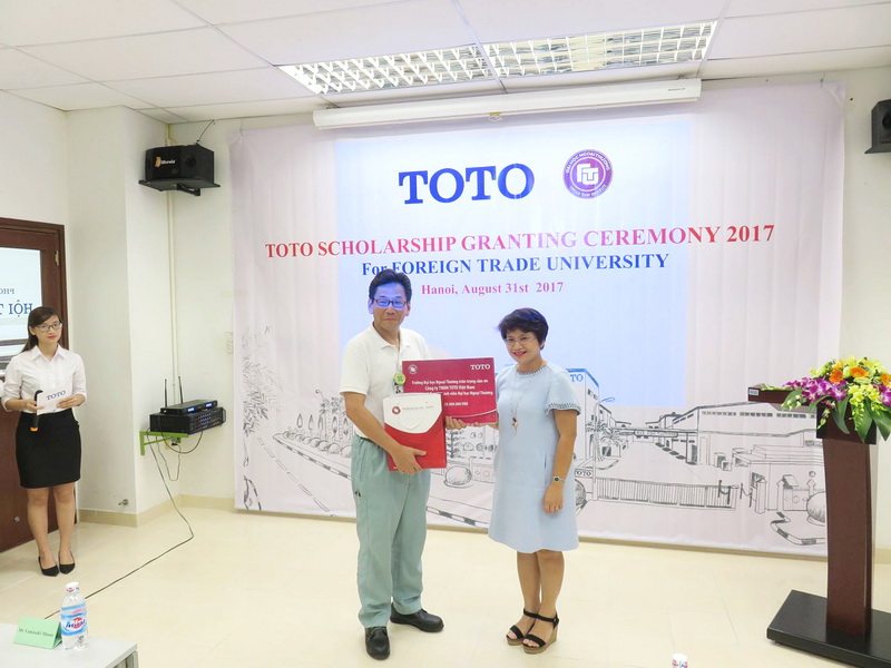On 31st August, 2017, a scholarship ceremony for two students of Foreign Trade University (FTU) took place at the headquarters of Toto Vietnam Co., Ltd. The ceremony was attended by Mr. Yamasaki Masao – General Director of Toto Vietnam Co., Ltd together with a large number of staffs and workers. From FTU, there was the presense of Assoc. Prof. Dr. Nguyen Thu Thuy – Vice President of FTU.