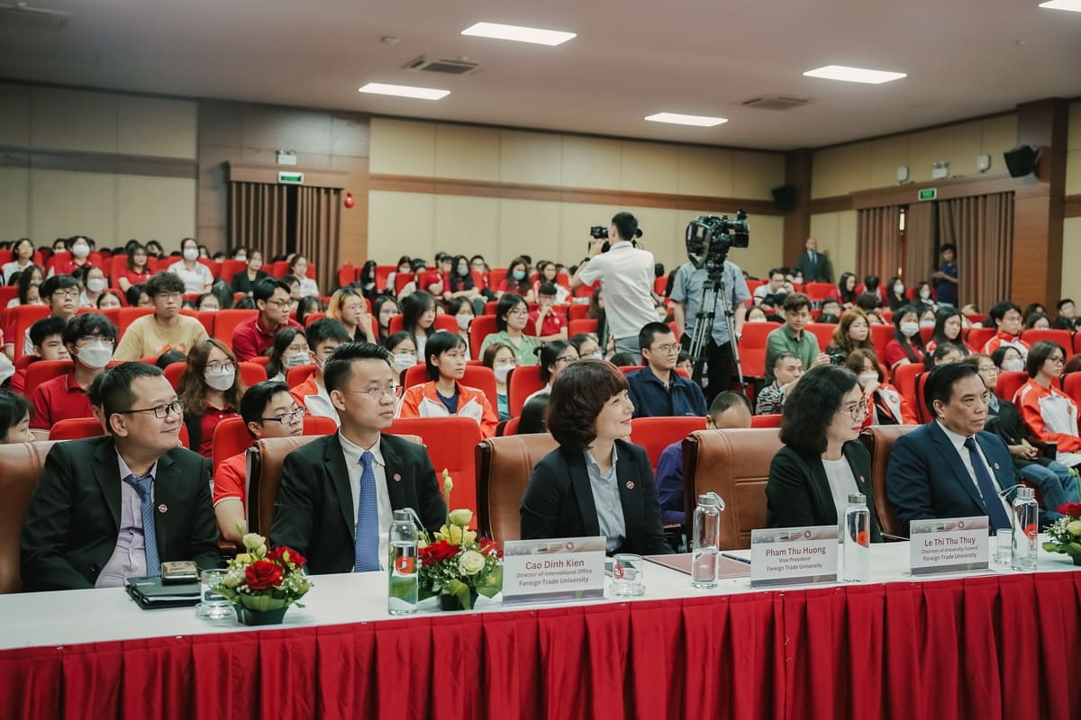 The university’s welcoming committee included Assoc.Prof.Dr. Bui Anh Tuan, Secretary of the Party Committee and University President, Assoc.Prof.Dr. Le Thi Thu Thuy, Deputy Secretary of the Party Committee and Chairwoman of University Council, and Assoc.Prof.Dr. Pham Thu Huong, Vice President, Assoc.Prof.Dr. Cao Dinh Kien, Director of Office of International Affairs, and heads and deputy heads of other units, as well as teachers and students.