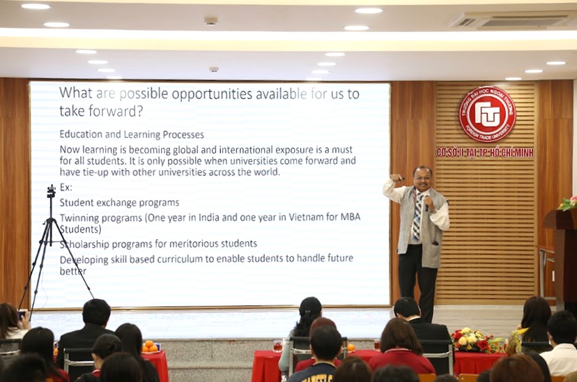 The presentation “Prospects of logistics and supply chains in developing countries” shared by Dr. Arcot Purna Prasad with Campus II students took place in a close and interesting atmosphere. Students listened to stories about how the Covid-19 pandemic had created challenges and opportunities for us and what do we need to do to overcome those challenges. Besides, Dr. Arcot Purna Prasad also shared more about the connection programs between CMR University and Foreign Trade University such as: Student exchange programs, scholarship programs, joint programs… are opportunities to connect and exchange professional knowledge in the future.